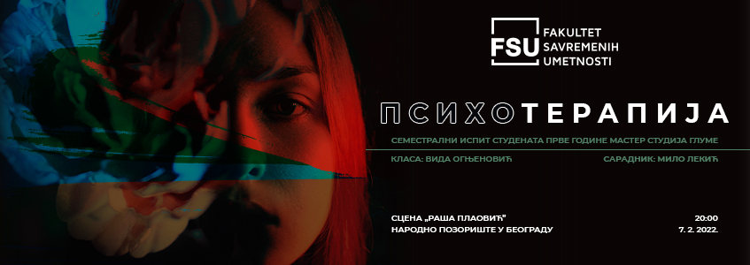 Studenti master studija glume sa Fakulteta savremenih umetnosti ponovo će svoje umeće pokazati na sceni jednog od naših najznačajnijih teatara. Svoju ispitnu predstavu „Psihoterapija” izvešće pred publikom u ponedeljak, 7. februara, s početkom u 20 časova, na Sceni „Raša Plaović”.
