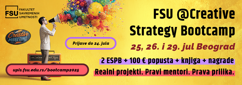 Fakultet savremenih umetnosti (FSU) te poziva da postaneš deo trodnevnog intenzivnog programa FSU @Creative Strategy Bootcamp, koji okuplja mlade vizionare iz sveta marketinga, biznisa, komunikacija i menadžmenta! Održava se 25, 26. i 29. jula 2025. u prostorijama FSU u Beogradu.