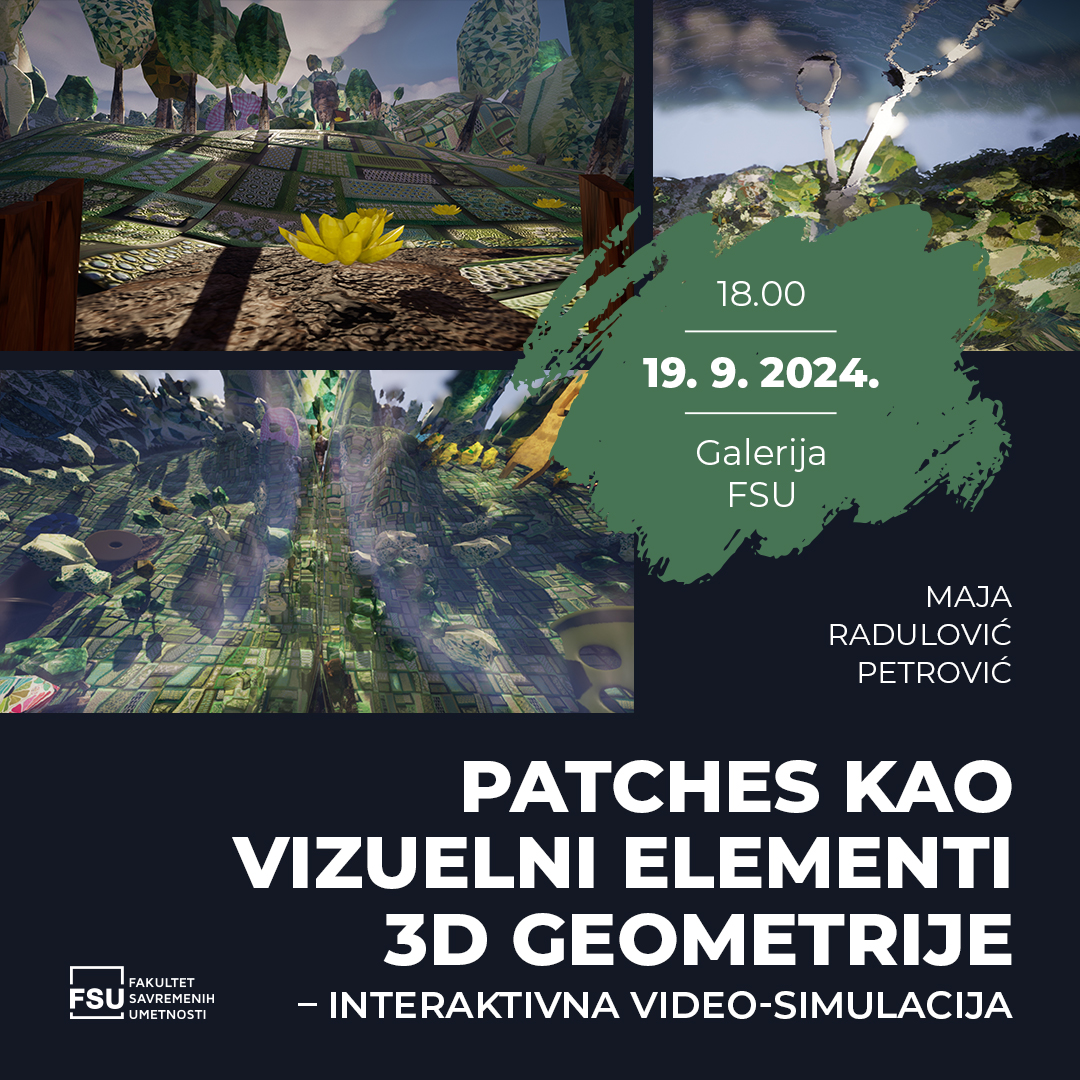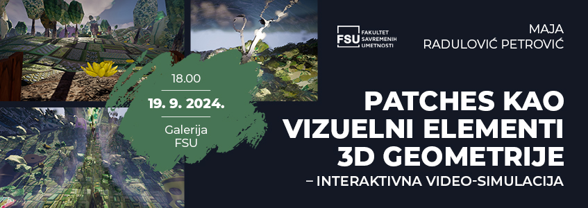 Galerija FSU sa zadovoljstvom najavljuje samostalnu izložbu umetnice mr Maje Radulović Petrović. Otvaranje ove doktorske umetničke izložbe će se održati 19. 9, u 18 časova, u Galeriji FSU. Izložba nosi naziv „Patches kao vizuelni elementi 3D geometrije – interaktivna video-simulacija” i predstavlja vrhunac dugogodišnjeg istraživanja i rada umetnice na polju klasične i digitalne fotografije, trodimenzionalnog modelovanja, karakter animacije, video-produkcije, specijalnih filmskih efekata i vizuelne umetnosti uopšte.