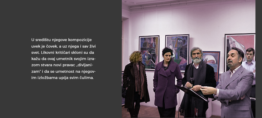 U središtu njegove kompozicije uvek je čovek, a uz njega i sav živi svet. Likovni kritičari skloni su da kažu da ovaj umetnik svojim izrazom stvara novi pravac „divljanizam“ i da se umetnost na njegovim izložbama upija svim čulima.