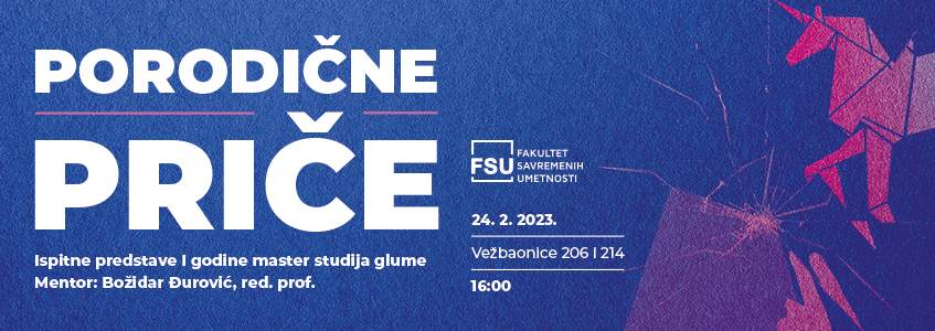 Studenti prve godine master studija glume 24. februara izveli su dva komada u okviru ispitne predstave „Porodične priče”. Ispit se održao u vežbaonicama 206 i 214 na Fakultetu savremenih umetnosti (Svetozara Miletića 12).