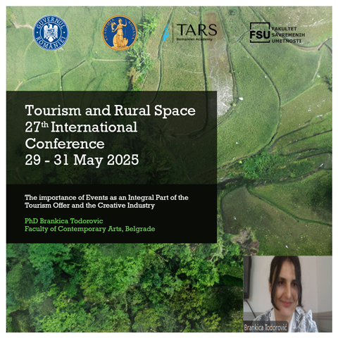 Profesorka Fakulteta savremenih umetnosti, dr Brankica Todorović, učestvovala je na 27. Međunarodnoj konferenciji „Tourism and Rural Space“, koja je održana od 29. do 31. maja 2025. godine u hibridnom formatu – uživo u rumunskom gradu Vatra Dornei i onlajn.