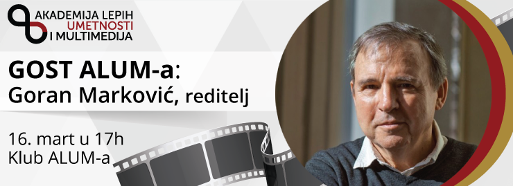 Zadovoljstvo nam je da vas obavestimo da će Akademija lepih umetnosti i multimedija ugostiti našeg proslavljenog reditelja Gorana Markovića, u četvrtak, 16. marta, u prostorijama Kluba ALUM-a.