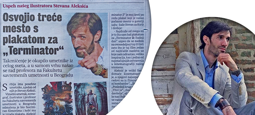 „Zauzeo sam treće mesto ove nedelje na listi vrsnih, svetskih ilustratora alternativnih filmskih plakata koji su u proteklih nekoliko dana poslali svoje ilustracije u planetarnu galeriju AMP (Alternative Movie Posters – the world’s largest curated collection). Ovaj sajt renomirani je trezor alternativnih filmskih plakata koje su kreirali talentovani autori sa svih strana sveta koji se bave tom jedinstvenom umetničkom disciplinom. „Terminator 2” je moj šesti po redu plakat, koji je našao počasno mesto u galeriji sajta”, objašnjava Aleksić.